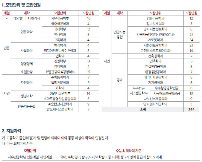 이제 모집인원을 볼게요.인문계열은 소수 학과 3~4명, 경영이나 국제, 호텔관광처럼 12~14명 선으로 조금 많이 뽑는 곳이 있습니다.무턱대고 모집인원이 40명이니까 자유전공을 지원하는 것은 오판일 수 있습니다.꼭 위의 올해 모의고사 문제를 풀어본 후에 결정하세요.