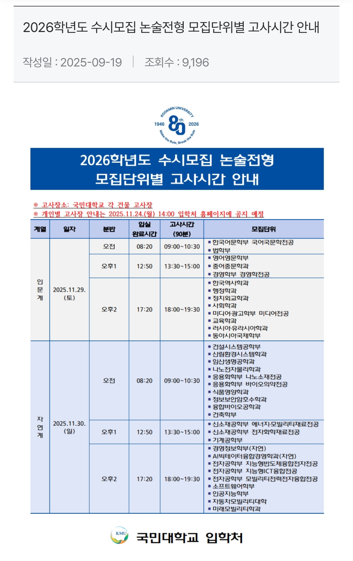 [조경미 논술] 국민대 2026학년도 논술 고사 시간 본문