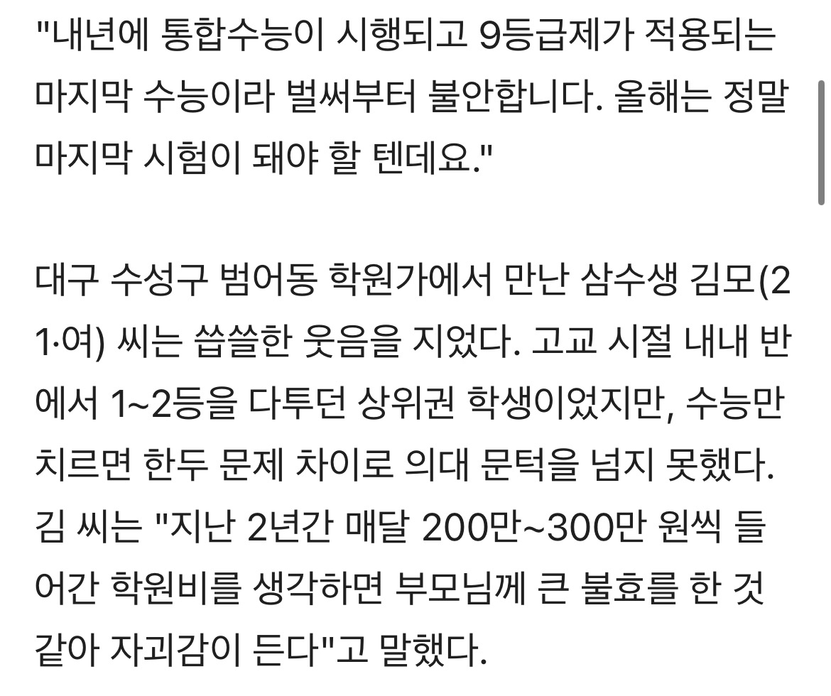 "내년에 통합수능이 시행되고 9등급제가 적용되는 마지막 수능이라 벌써부터 불안합니다. 올해는 정말 마지막 시험이 돼야 할 텐데요." 대구 수성구 범어동 학원가에서 만난 삼수생 김모(21·여)