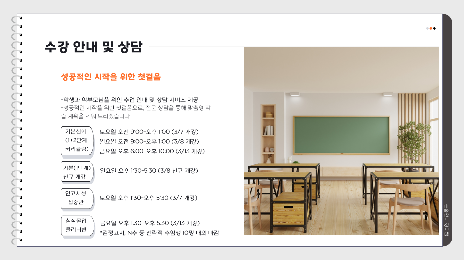 * 첨삭 몰입 클리닉반(6주 완성): 금요일 1:30 개강, 6주 수강 후 주말반 이동