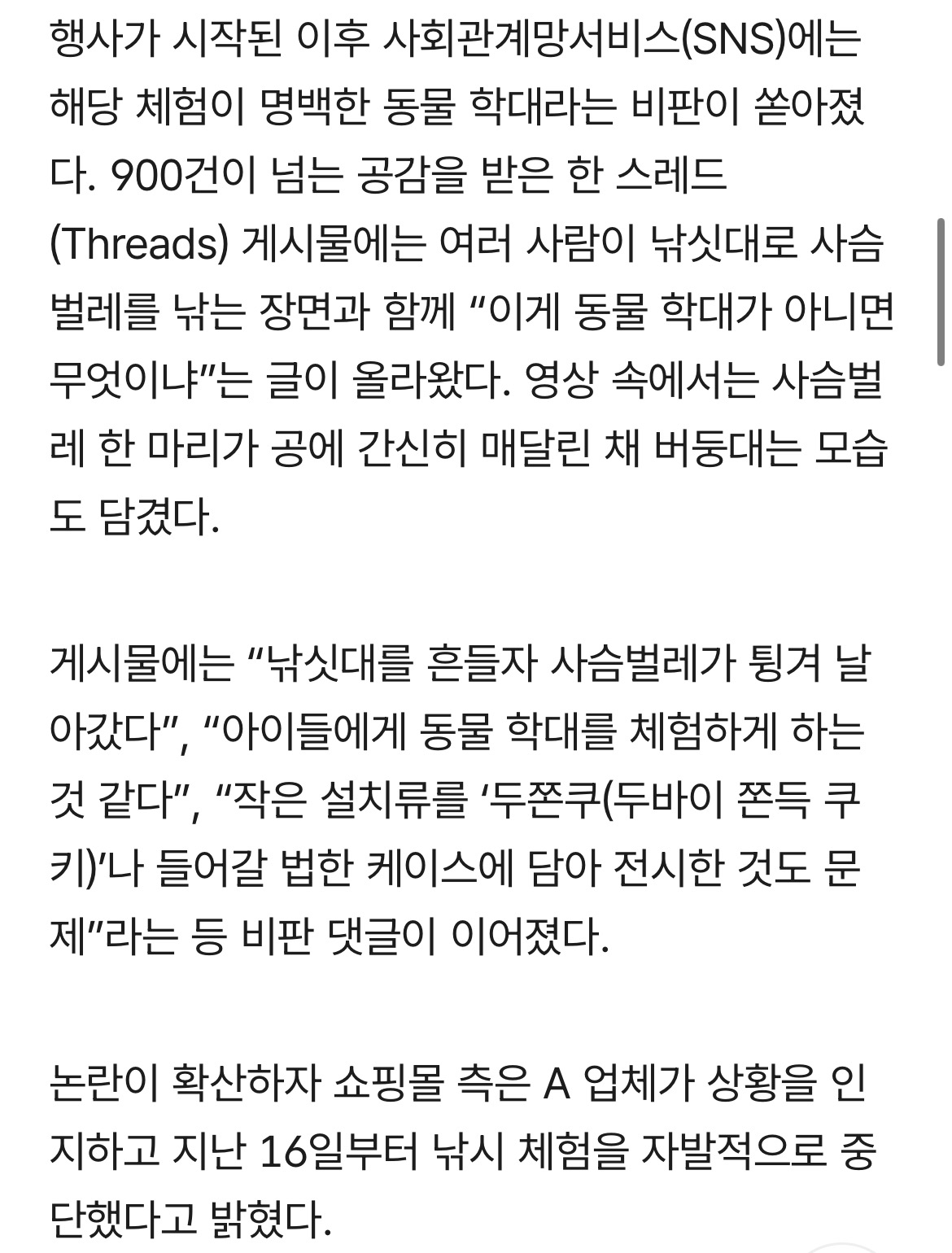 서울 영등포구의 한 대형 복합쇼핑몰에서 열린 이색 동물 팝업스토어가 살아있는 사슴벌레 등을 낚싯대로 건져 올리는 체험 행사를 진행해 동물 학대 논란의 중심에 섰다. 19일 유통업계에 따르